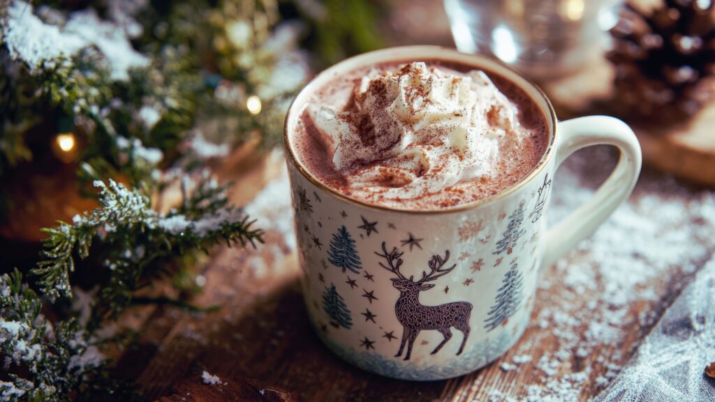 • A small hot cocoa or tea station with festive mugs and treats.